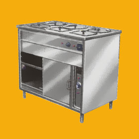 A Double purpose combination unit to serve hot food during peak hours. Bain-Marie with heavy top, water tank with round or square vessels. Hot-case with outer body stainless steel, inner casing aluminium, both sides insulated sliding doors, with good quality air heaters thermostatically controlled. Could be fabricated as per customer’s requirements.