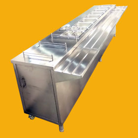A very Hygienic way to display & serve hot food in commercial malls. Completely Stainless Steel unit with heavy duty water tank mounted on sturdy frame structure with molded glass in front for viewing, giving good aesthetic appearance. S.S. rectangular containers with lids. Gas or electrically operated thermostatically controlled. Nos of containers & size of unit could be fabricated as per customer’s requirements.